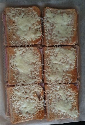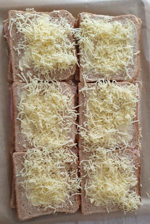 7. Sortir du four et retourner les croques-monsieurs. Déposer du gruyère sur cette face.
