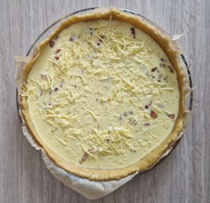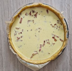 5. Verser la préparation sur les lardons et garder une bonne répartition des lardons sur la pâte.